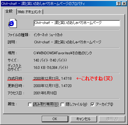 ホムペにアクセスして『w(゚ o゚)w オォー!見たことあるぅ〜!っていうかブックマーク入ってるがな!』と思って、 ふと考えたのが「しっかし、いつここを見つけたんだったっけな?」でした。それで、プロパティを見てみたら、 上のような結果になりました。なんと去年の12月には見つけちゃってたんですね〜♪(≧m≦)ぷぷっ! もちろん、検索サイトから「なっちん」で検索して見つけたんですが・・・^^;
